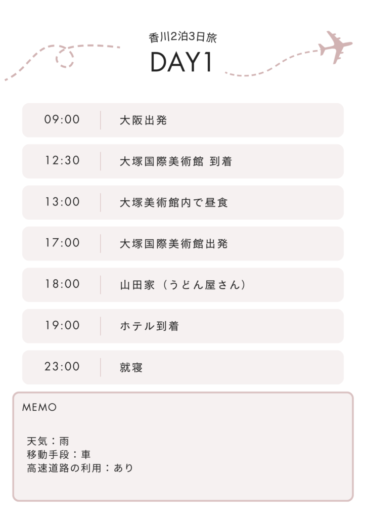 今回は、大阪から香川への2泊3日のモデルコースを作成したので、ぜひ皆さんも参考にしてみてくださいね。